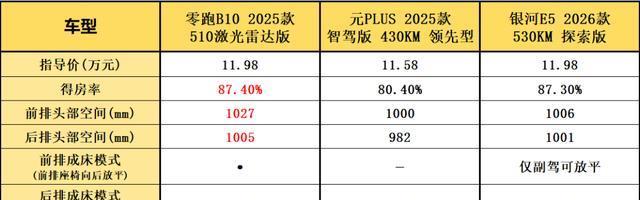 比如现在外出露营流行的大床模式。虽然三款车的后排都能放倒变成床,但是在前排拓展性上,元PLUS就没有该项功能了。银河E5的副驾可以向后放平成床,主驾则不行。而零跑B10的主副驾都可以放倒成床,便利性会更高。
