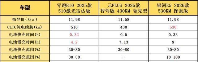 作为纯电车型,首先要关注的续航和充电问题。虽然价格相仿,但三款车的CLTC纯电续航还是存在一定差异,元PLUS为430km,城市出行没问题,但是要想跨城的话,可能就会有些焦虑了。而银河E5和零跑B10续航都超过了500km,就算是偶尔跑跑长途,也不会太焦虑。