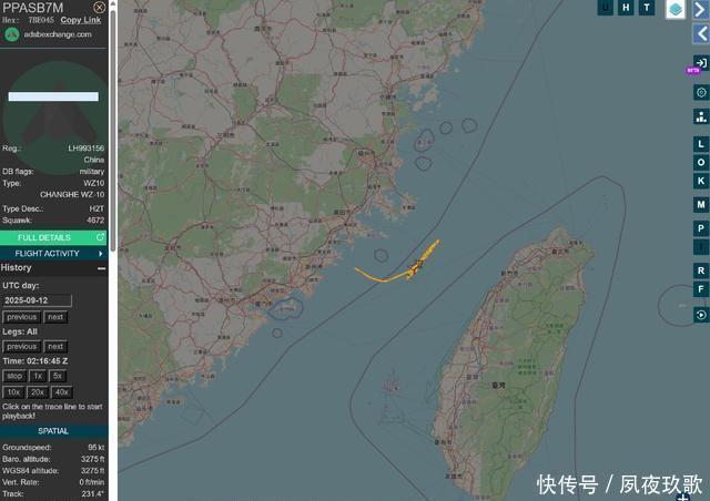 9月12日,美国海军“希金斯”号驱逐舰与英国皇家海军“里士满”号护卫舰组成联合编队,以所谓“自由航行”为名穿越台湾海峡。解放军东部战区则迅速组织海空兵力全程跟监警戒,有效应对处置。 01.英美舰队穿台海放飞机挑衅,中方直升机群下降1100米迅速迎战 有意思的是,根据当天的ADSB信号表明,当天至少3架隶属东部战区海军航空兵的武直10武装直升机组成的机群通过ADSB信号被捕捉到,显然是执行监视美英舰队的动向。