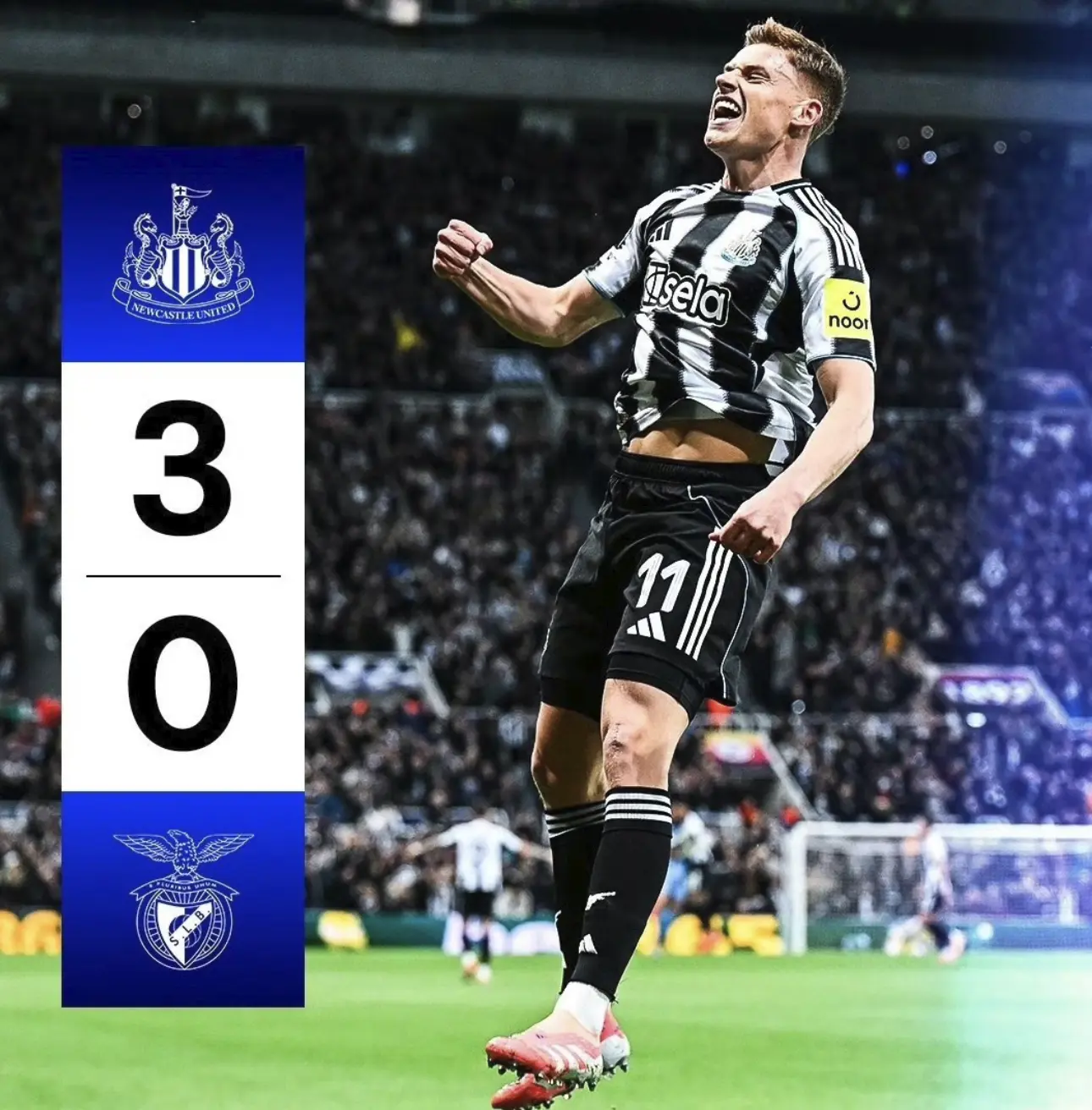 在今日的比赛中,本菲卡在客场遭遇完败。在与纽卡的比赛中,本菲卡射门7-19落后,射正2-10,两队的得分机会比为1-5,本菲卡被纽卡全面压制。最终凭借戈登的一射一传,以及替补出场的巴恩斯的梅开二度,纽卡3球轻取本菲卡。纽卡本赛季欧冠2胜1负,已经拿到6个积分,暂时排在积分榜第7位,反观本菲卡,他们难求一胜。