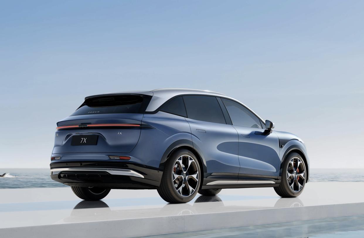 极氪7X采用了轿跑SUV的车身轮廓,倾斜的A柱与弧线形的车顶以及略带溜背式的车尾,再搭配着光影效果明显的车身型面和若隐若现的肩线、腰线设计,展现出了十分灵动的一面。四个隐藏式的门把手、四个无边框感应式车门、水滴形的倒车镜外壳,提升了整车的轿跑属性。配备了19英寸铝合金材质的轮圈,再加上银色的刹车盘和红色的刹车卡钳,进一步强化了整车的运动气息。车辆基于SEA浩瀚架构,极氪7X的长宽高分别为4825/1930/1666(1656)mm,轴距为2925mm,还拥有863mm短前悬设计,座舱得房率超过83.34%,开门角度接近90°,更加方便乘客上下车。车内采用了双层压胶玻璃,还配备后排双侧电动遮阳帘/隐私玻璃,还带有温度调节的冷箱箱、后排电动桌板/电动智慧屏,舒适性和科技感拉满。